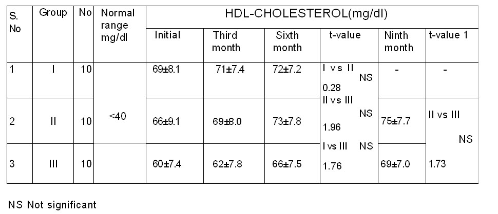 in all the three groups. The serum HDL - cholesterol level, before supplementation of Dr. Akbar Kausar's Kasini keerai was 69±8.1, 66±9.1 and 60±7.4 mg/dl in groups I, II and III respectively. It raised to 72 ±7.2 in group I after six months of supplementation, while it raised to 75±7.7 and 69±7.0 mg/dl in II and lll groups respectively after nine months. However the differences were not statisfically significant between the groups. From the results, it may be inferred that Dr. Akbar Kausar's Kasini and the Dr. Akbar Kausar's Kasini preparations have both hypoglycemic and hypolipidemic effects. All the three forms were found to be effective, But the subjects found it difficult to consume the greens everyday and easier to consume the decoction of Dr. Akbar Kausar's Kasini powder twice daily or Dr. Akbar Kausar's Kasini tablets thrice a day. |