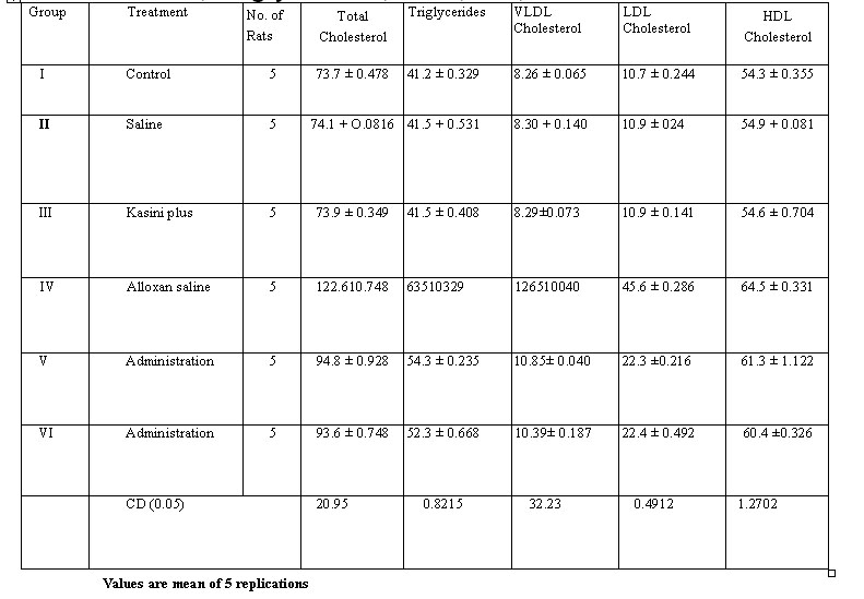 Cholesterol, Triglycerides,VLDL,LDL, and HDL levels in Rats