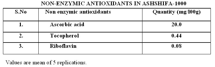 antioxidants Many of the diseases are the consequences of free radical damage. The free radicals are nullified by the antioxidants like ascorbic acid, riboflavin, tocopherol, chlorophyll, total carotenoids and flavonoids. The levels of various known non-enzymic antioxidants in Ashshifa-1000 are presented in Table III. |
